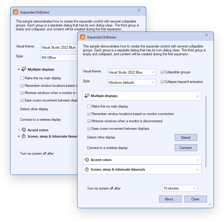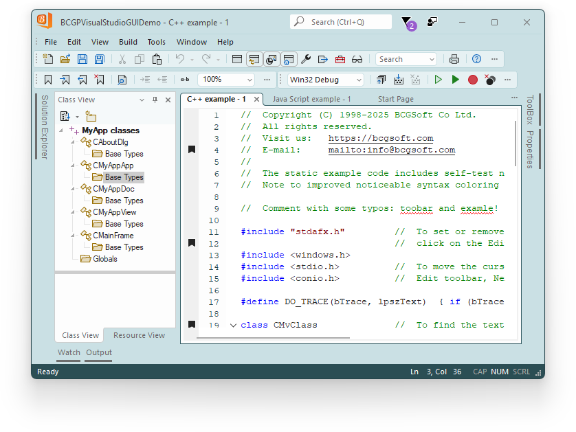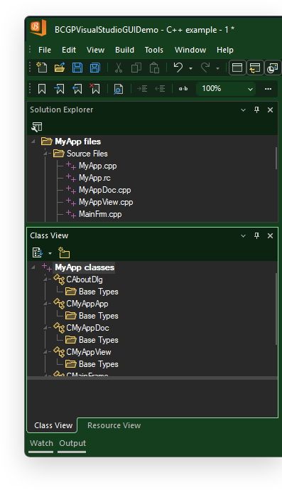 Release Notes BCGControlBar Professional Edition Version: 37.1. Released: 11/12/2025 Implemented Visual Studio 2026 (Insiders version) support (the retail product versions only). Our products are fully ready to be used with the upcoming version of Visual Studio: We have prepared the libraries' projects and solutions for Visual Studio 2026. The integration wizard has been updated, and now you can integrate and build the libraries in the new Visual Studio. We have ported the BCGControlBar Pro Application Wizard to Visual Studio 2026. All of our examples and samples were thoroughly tested with the new development environment in the various platforms and with different C++ compiler standards. We have implemented a preview of the Visual Studio 2026 visual manager (see screenshot). This implementation is included in the BCGPVisualStudioGUIDemo as a custom visual manager, but if you like it, you can copy the CVisualManagerVS2026 class to your application source code. The key features of this new visual theme are: Modern, Fluent UI-inspired look. 10+ ready-to-use color themes (see screenshot). The active docking panes, tabs and MDI children are surrounded by the accent color borders (see screenshot). Small gap between the toolbar rows (see screenshot). Once the final release of Visual Studio 2026 is ready, we will finalize this visual theme and add it to the library. Ribbon Bar Improved spacing between controls in the touch mode (see screenshot): the layout of the Ribbon in this mode is very similar to the latest MS Office versions. The new method CBCGPRibbonBar::SetContextCaptionVisible allows you to specify the visibility of the contextual tab's caption. By default, the caption is always displayed if the search box is not located on the ribbon caption. The new method CBCGPRibbonBar::EnablePaletteScrollButtons allows you to show or hide the scroll buttons for the Ribbon gallery (as you can see in the MS Office 2021-2024 applications, the gallery scroll buttons no longer exist). In addition, you can specify the scroll buttons' visibility in the specific gallery by calling a new method, CBCGPRibbonPaletteButton::SetScrollButtons. In the regular ("classic") ribbon mode, the scroll buttons are always visible by default; in the simplified mode, they are hidden. CBCGPRibbonComboBox: SelectItem, DeleteItem, GetItem and GetItemData methods have a new, optional parameter, 'bSkipGroups' (FALSE by default). If this item is TRUE, the methods are skipping groups and returning only the "real" item/item data. CBCGPRibbonComboBox now supports the left-aligned selection bar in the dropped-down list item (see screenshot). By default, this bar is drawn only in the Office 2021-2024 and Native Windows themes, but you can specify this bar appearance by calling a new method, SetSelectionBarInDropDown. CBCGPRibbonPanel::SetName has a new, optimal parameter, 'bUpdateDefaultButton' (FALSE by default). When this parameter is TRUE, the text label of the default button (displayed when the panel is collapsed) is also updated. Ribbon customization dialog: the appearance of the tree controls has been improved (see screenshot). The expand/collapse buttons now feature an explorer style, and the background color of selected items provides greater contrast. The ribbon caption bar MDI tabs have an improved appearance in the Office 2021-2024 themes, featuring rounded corners similar to those found in Microsoft Edge and Google Chrome browsers (see screenshot). Ribbon designer additions: Ribbon bar: added two new properties. 'Context Captions Visible' specifies whether the caption above the contextual tabs is displayed. TRUE always displays the caption; FALSE never displays the caption; and DEFAULT displays the caption only if the ribbon search box is not located on the caption. 'Palette Scroll Buttons' specifies whether the palette (gallery) control has the scroll buttons. The ribbon combo box has a new property called 'Selection Bar.' TRUE: always display the color bar on the left of the selected item; FALSE - never display the bar; Default—the bar appearance is specified by the active visual theme. The ribbon palette button has an added property called 'Scroll Buttons.' TRUE: always display the scroll buttons; FALSE: never display the scroll buttons; DEFAULT: the scroll buttons' appearance is specified by the parent ribbon bar. Toolbars and Menus CBCGPToolbarButton: a new method IsOnDockedToolbar tells whether the parent toolbar is docked. CBCGPToolbarComboBoxButton additions: SetSelectionBarInDropDown: specifies whether the drop-down list selected item has a selection bar on the left (see screenshot). By default, this appearance is specified by the active visual manager (the selection bar is available in the Office 2021-2024 and Windows 11 native themes). IsSelectionBarInDropDown: tells whether the drop-down list selected item has a selection bar on the left. SetDropDownAutoWidth: specifies whether the drop-down list has a width of the widest item (see screenshot). By default, this attribute is specified by the new global flag CBCGPComboBox::m_bDropDownAutoWidth. GetDropDownAutoWidth: tells whether the drop-down list has the width of the widest item. The CBCGPToolBar::CustomizeButtonStyle enumerator has a new member, CUSTOMIZE_BUTTON_VISUAL_THEME, which means that the custom (toolbar options) button style is specified by the active visual manager. CBCGPToolbarOptions: a new attribute, m_bQuickCustomization (TRUE by default), specifies whether the quick customize menu should be displayed by clicking the toolbar customization button. The CBCGPWinApp::SetToolbarOptions method has a new, optional parameter, 'bUpdateExistingToolbars' (FALSE by default). If this parameter is TRUE, the options will be applied to all previously created toolbars. Dialogs and Forms CBCGPColorDialog: now, you can specify whether the second page of the color dialog will be activated on startup. You can do this either by setting a new class constructor para