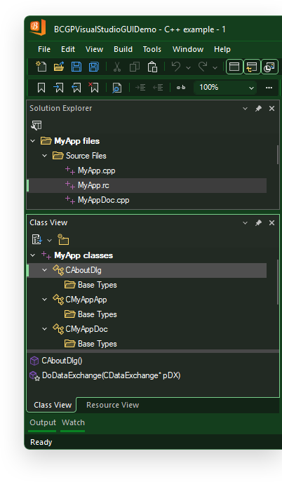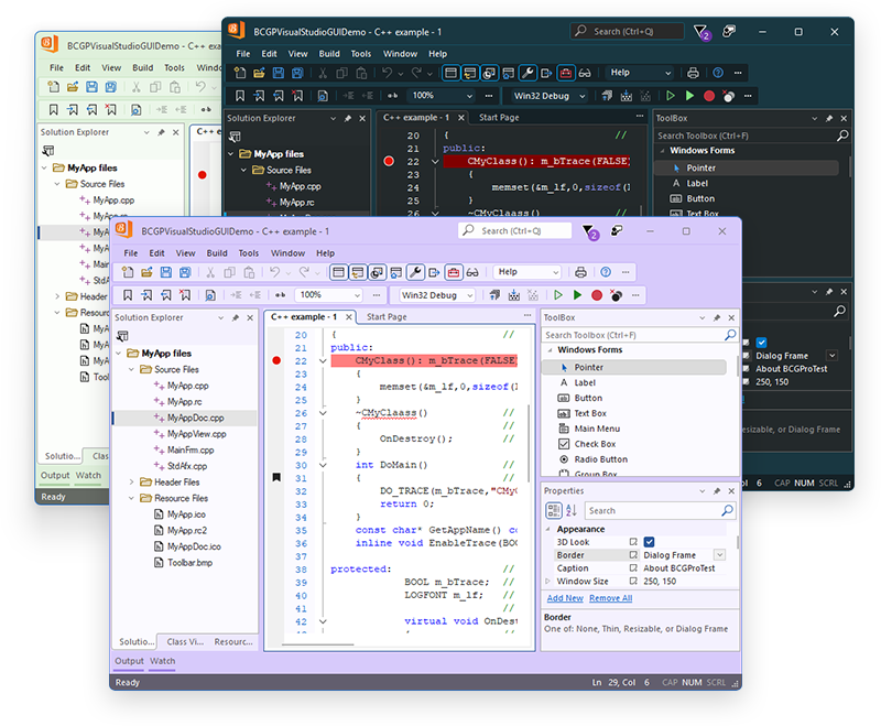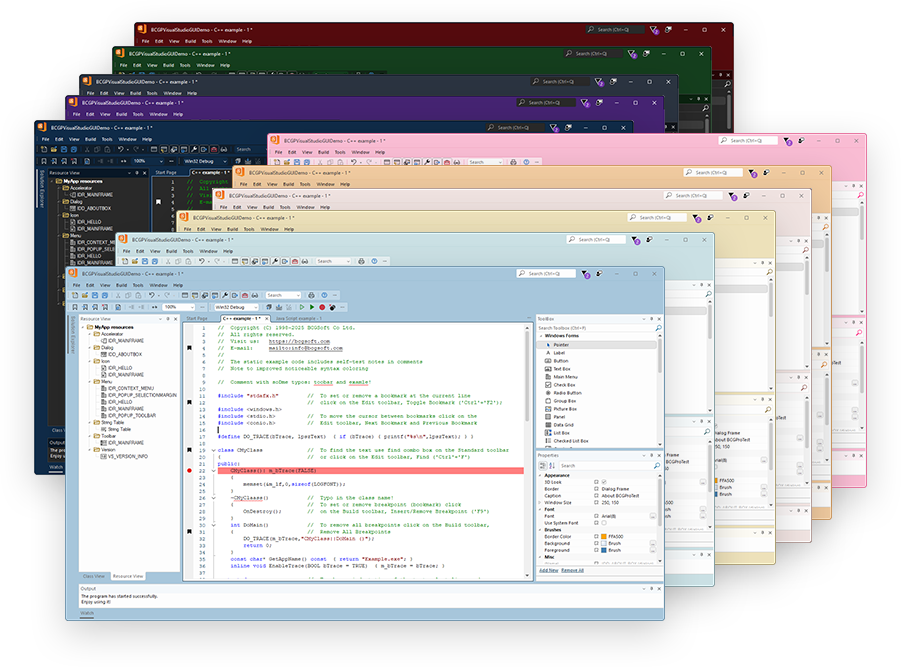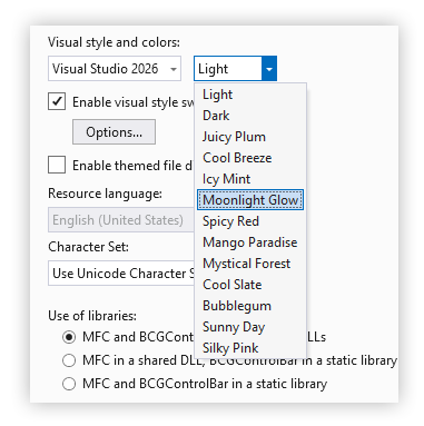 Release Notes BCGControlBar Professional Edition Version: 37.2. Released: 12/03/2025 We have implemented Visual Studio 2026 support for both retail and evaluation product versions. The pre-built evaluation libraries and DLLs for Visual Studio 2026 are fully tested and uploaded to our servers. If you don't have the active product subscription but would like to verify your product built with one of the former versions of our libraries in Visual Studio 2026, please download the 30-day fully functional evaluation version. The new class CBCGPVisualManagerVS2026 implements a Visual Studio 2026-like theme (see screenshot). From now on, you can easily add a new, fresh look to your existing application using just one line of code. The key features of this new visual theme are Modern, Fluent UI-inspired look. 10+ ready-to-use color themes (see screenshot). User-defined themes (see screenshot). The docking pane pin/unpin buttons have a new look (see screenshot). The new highlightable toolbar grippers have a fresh design (see screenshot). Checkboxes and radio buttons with a larger size and contrast look (see screenshot). The active docking panes, tabs, and MDI children are surrounded by accent-colored borders (see screenshot). Small gap between the toolbar rows (see screenshot). BCGP_VISUAL_THEME_VS_2026_LIGHT, BCGP_VISUAL_THEME_VS_2026_DARK and others were added to the BCGP_VISUAL_THEME enumeration. For your convenience, we have added this new theme to the BCGControlBar Pro Application Wizards (see screenshot). Although this theme was designed for the toolbar-based application, you can also use it in the ribbon-based UI (see screenshot). Our sample RibbonGadgets demonstrates this. Please look at BCGPVisualStudioGUIDemo, BCGPControls and other examples and samples to examine this new appearance. Controls CBCGPTreeCtrlEx: Implemented the vertical selection bars (located on the left side of the selected item—see screenshot). By default, this bar is drawn only in Office 2021-2024, Visual Studio 2026 and native Windows themes, but you can specify its visibility by calling a new method, SetItemSelectionBar (for the specific control), or by changing a new global class member, m_bItemSelectionBar (for all controls). CBCGPPropList: enhanced the property subitem support: The CBCGPProp::AddSubItem method has a new, optional parameter, "nInsertAt," which allows specifying the added subitem position. A new method, CBCGPProp::GetSubItemIndex, retrieves the specific subitem index. The CBCGPProgressCtrl has an improved appearance in marquee mode when using modern visual themes (see screenshot). The new Visual Studio 2026 theme has been applied to many of our controls, such as the grid, calendar, editor, and others (see screenshot). Edit control Improved colors in the dark themes: the editor foreground colors (specified in the language settings XML file) have more contrast now and are easily readable when the edit control has a dark background (see screenshot). Enhanced supported color formats in the XML file for language settings. In addition to the previously supported basic color names and 'rrggbb,' we have added the Web color name support and the '#rrggbb' and '#rgb' formats. Miscellaneous MSAA: If the accessibility support is disabled in the global data, the EnableActiveAccessibility method is not automatically called anymore. This problem was in some specific classes, such as CBCGPButton, CBCGPListBox, and others. Smart docking indicators have added the following new styles: BCGP_SDT_VS2012_DARK (see screenshot): used in the Visual Studio 2012-2019 and Office 2016-2024 dark themes. BCGP_SDT_VS2022_DARK (see screenshot): used in the Visual Studio 2022-2026 dark themes. CBCGPGraphicsManager and CBCGPPyramidChartImpl: improved the 3D pyramid appearance (see screenshot). Integration Wizard: removed the option to install a legacy (HTML-based) Application Wizard in Visual Studio 2017-2019. BCGTranslator: implemented loading of the combo box items from the dialog info (DLGINIT section) in the resource file. From now on, you don't need to manually add these source strings to the translation grid, so the dialog translation is much easier now. Examples and Samples The new Visual Studio 2026 theme has been added to many of our examples and samples. BCGPControls: added demonstration of how to display the selection bar in the extended tree control item. BCGPVisualStudioGUIDemo: demonstrates Visual Studio 2026 themes with a custom color. Fixes CBCGPDockingControlBar: the docking pane located in the rebar does not have an unnecessary active border now. CBCGPTasksPane: addressed an issue with the scroll button height in the multi-DPI environments. CBCGPSliderCtrl: addressed some issues with incorrect tick mark positions when the control has the TBS_AUTOTICKS style. CBCGPPropertySheet: omitted an unnecessary tree control scroll after the property page activation by clicking the tree node. CBCGPCalculator: fixed the bug with incorrect processing of the '.' character in the environments where the decimal point is displayed as ',' or another symbol. CBCGPBreadcrumb: if the breadcrumb item has user-defined data, this data is assigned to the drop-down corresponding menu item. CBCGPChartVisualObject: addressed issues with the incorrect location of the data labels in the pyramid and funnel charts in specific cases.