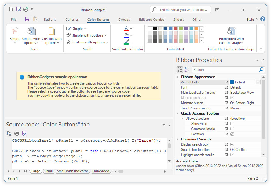 This comprehensive sample demonstrates how to create and utilize various Ribbon Control and Ribbon Status Bar gadgets,