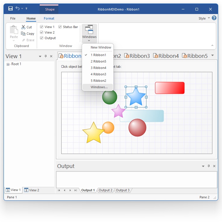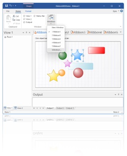 Demonstrates how to use Ribbon Control in an MDI (multi-document interface) application. You can tear off any document and see how the Ribbon, located in the main application frame, works with the currently active frame.