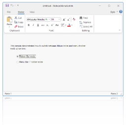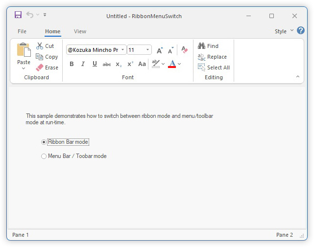 This sample demonstrates how to switch between Ribbon mode and Menu/Toolbar mode at run-time.