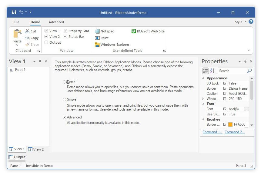Demonstrates Ribbon application modes. In each mode (such as "Demo," "Simple," and "Advanced"),