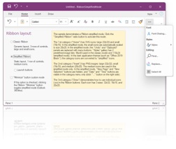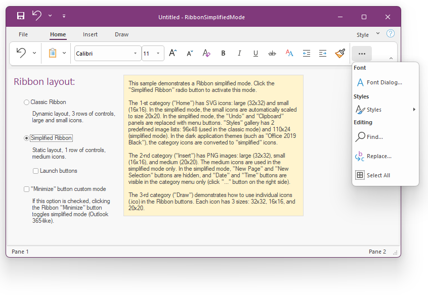 Demonstrates Office 2019-2024/365-like Ribbon simplified mode.